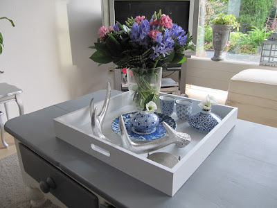 Een dienblad met accessoires en prachtige bloemen, als je het op een blad bij elkaar zet dan word het weer een geheel. |